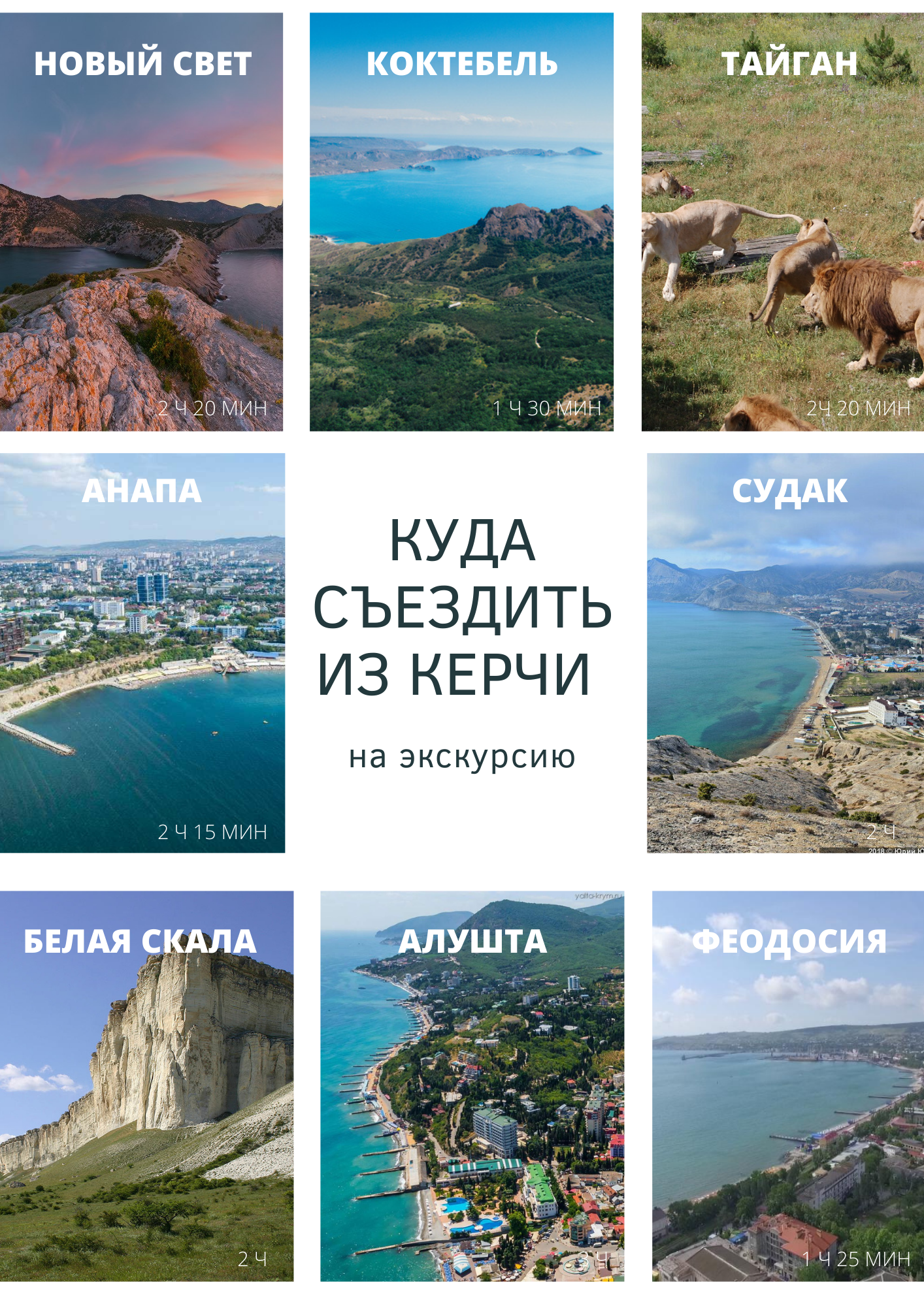 Феодосия 1ч 25 мин Генуэзская крепость Картинная галерея Айвазовского Музей Александра Грина Церковь Святой Екатерины Коктебель 1ч 30 мин Кара-Даг Дом-музей Максимилиана Волошина Скала “Золотые ворота” Аквапарк, дельфинарий Белая скала 2ч Суворовский дуб Скала Ак-Кая Лавандовое поле Парк львов Тайган 2ч 20 мин Судак 2 ч Генуэзская крепость Кипарисовая аллея Меганом Аквапарк Новый свет 2 ч 20 мин Тропа Галицына Завод шампанских вин Анапа 2ч15мин Горгиппия археологический музей Кипарисовое озеро Алушта 3ч Водопад Джур-джур Долина привидений Храм-маяк Святого Николая Чудотворца